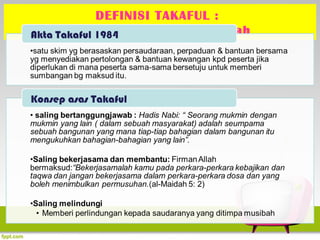 . Menurut Akta Takaful 1984 takaful didefinisikan sebagai satu skim yang berasaskan persaudaraan perpaduan dan bantuan bersama yang menyediakan pertolongan dan bantuan kewangan kepada peserta-peserta jika diperlukan di mana peserta-peserta sama-sama bersetuju untuk memberi sumbangan bagi maksud itu. Dalam istilah fiqh ar-Rahn bermaksud menjadikan sesuatu harta sebagai. Kamus Dewan Edisi Keempat.